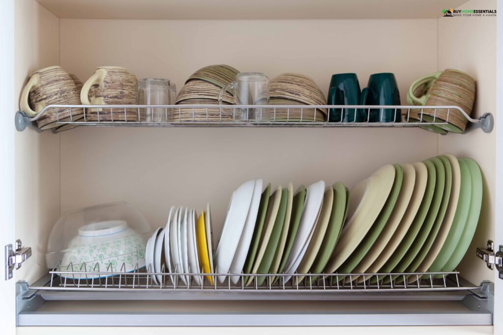 • Categorize dishes by type (plates, bowls, glasses, etc.). Arrange them in separate sections within the cabinet for easy access and neat storage.